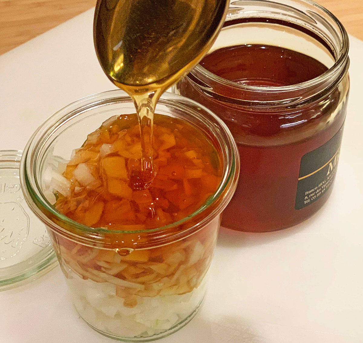 Mit Honig mischen: Gib die Zwiebelwürfel in das Glas und bedecke sie vollständig mit Honig.