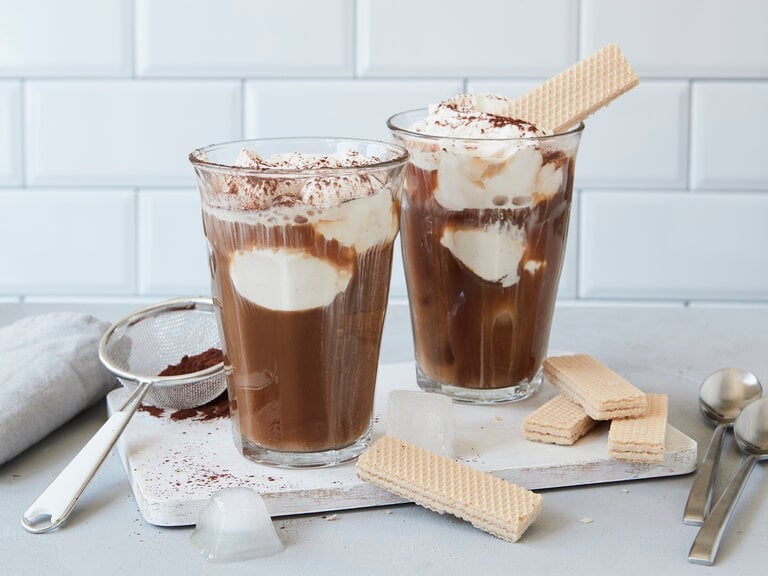 Für Schokoladenliebhaber: Ersetze einen Teil des Kaffees durch kalte Schokomilch oder füge einen Teelöffel Kakaopulver hinzu. Eine Kugel Schokoladeneis sorgt für extra Schmelz.