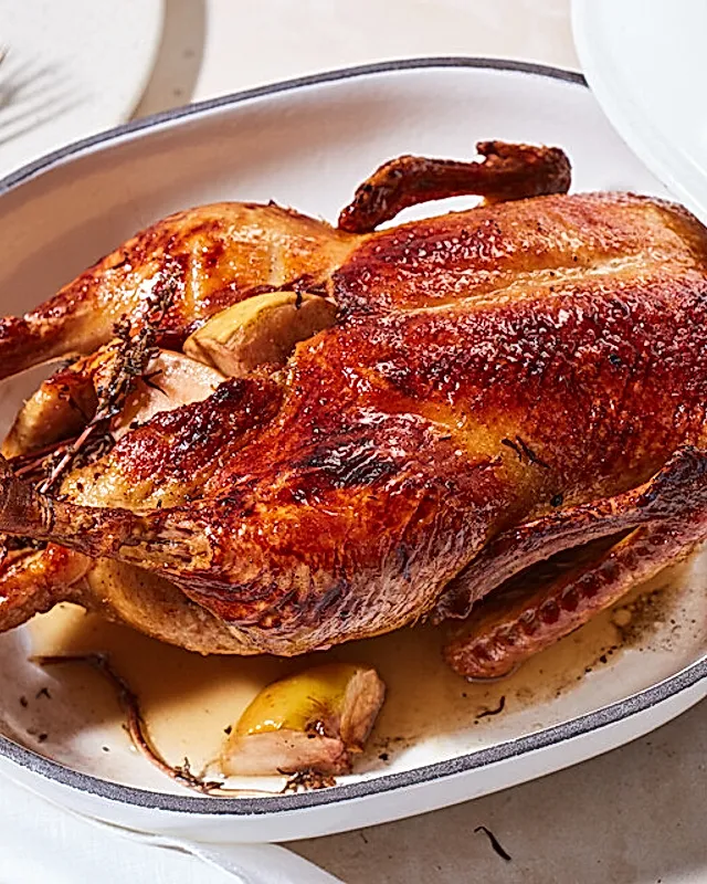 Bestreiche die Ente in den letzten 20 Minuten mit etwas Salzwasser oder Honig-Butter-Mix und erhöhe die Temperatur auf 220 °C. So wird die Haut unwiderstehlich kross!