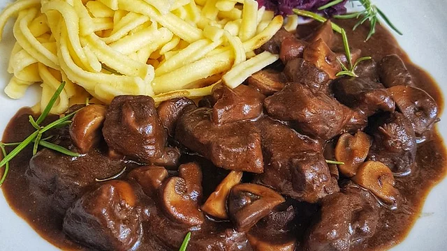 Verwende zarte Rehmedaillons statt Gulaschfleisch und schneide sie in dĂĽnnere StĂĽcke.