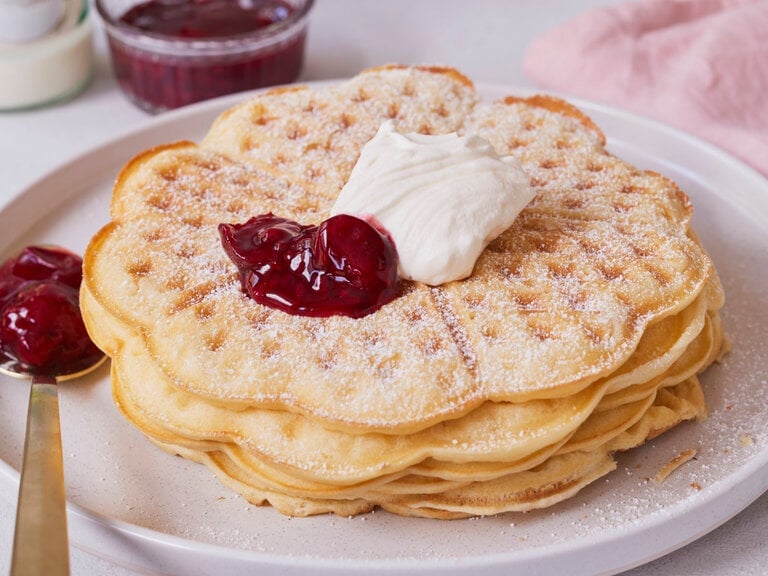 Wärme speichern: Wer mehrere Waffeln backt, hält sie bei 100 °C im Ofen warm – aber nicht abdecken, sonst werden sie weich!