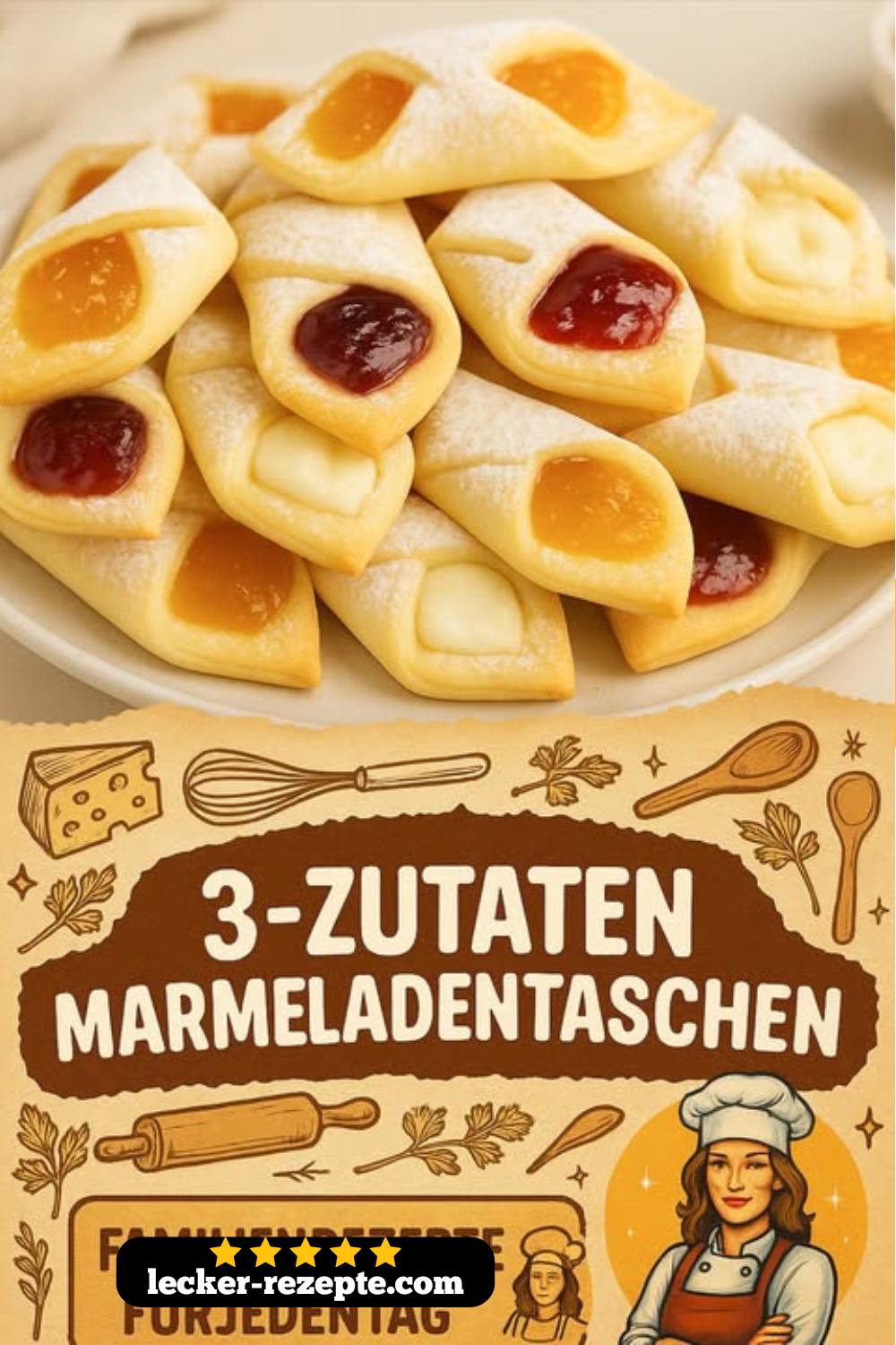 Diese drei einfachen Komponenten sind alles, was du brauchst, um köstliche Marmeladentaschen zu zaubern, die – wie der Suchbegriff beschreibt – „blitzschnell gemacht“ und „himmlisch fruchtig-knusprig“ sind.