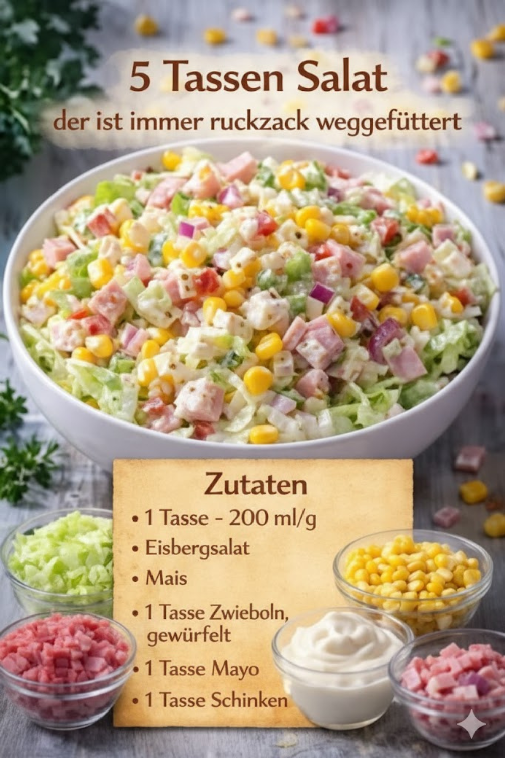 5 Tassen Salat der ist immer ruckzuck weggefuttert! ist das perfekte Rezept für alle, die gesunde, schnelle und leckere Mahlzeiten lieben. Mit frischem Gemüse, aromatischen Kräutern und einem einfachen Dressing lässt sich dieser Salat im Handumdrehen zubereiten und begeistert Groß und Klein. Ob als leichte Mahlzeit, Beilage oder Party-Snack – dieser Salat verschwindet garantiert schneller vom Tisch, als man schauen kann.