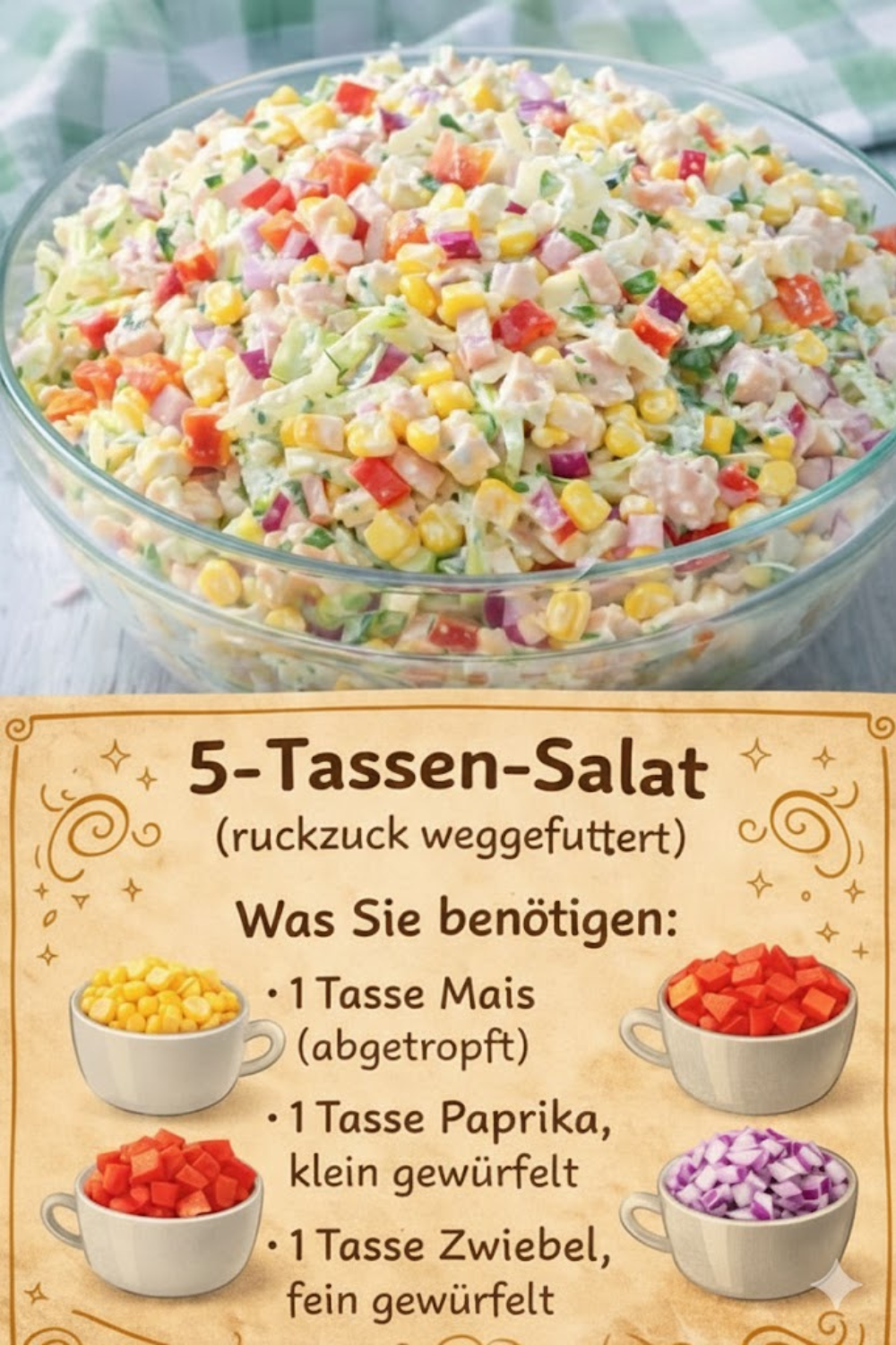 SEO-Schlüsselwörter: 5-Tassen-Salat, cremiger Salat, schneller Salat, Salat Rezept, frischer Salat, ruckzuck Salat, Salat für jede Gelegenheit, Salat für Familie, cremige Salatsauce