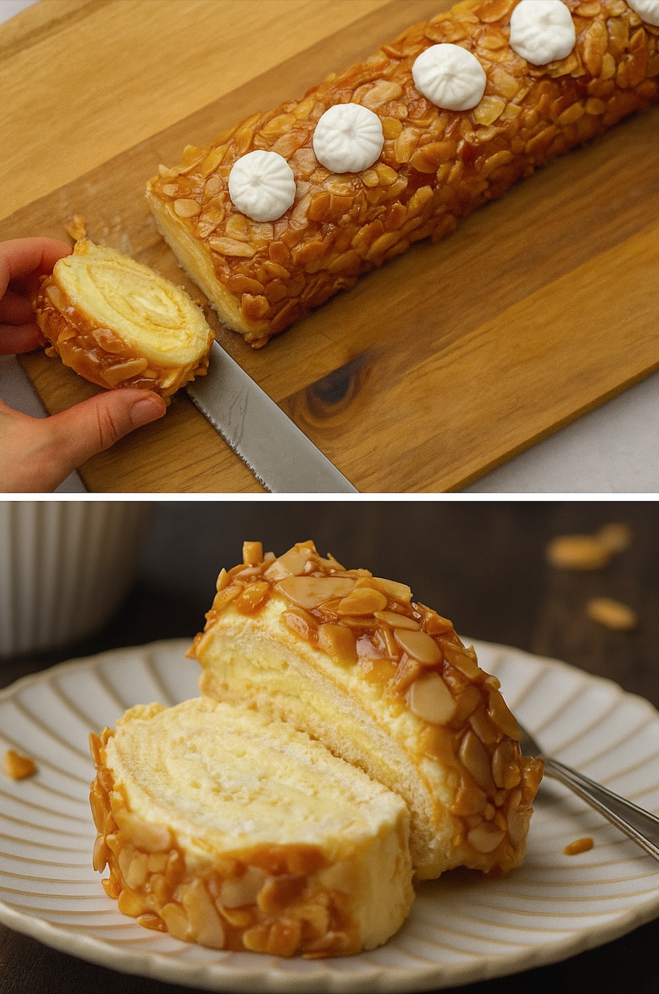 Das Ergebnis ist ein Kuchen, der nicht nur optisch beeindruckt, sondern auch geschmacklich überzeugt: Der Biskuit nimmt die Vanillecreme perfekt auf, während die typischen Mandelblättchen und karamellige Toppings für ein leichtes Knuspererlebnis sorgen.