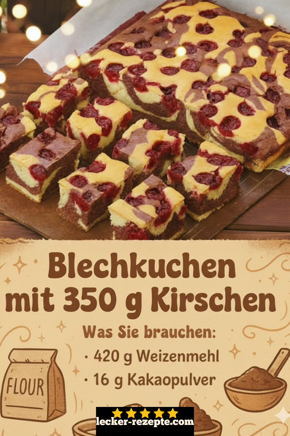 Ein Teil des Mehls kann durch Kakaopulver ersetzt werden, sodass ein schokoladiger Teig entsteht. Die Kirschen harmonieren wunderbar mit der Schokolade und machen den Kuchen besonders saftig.