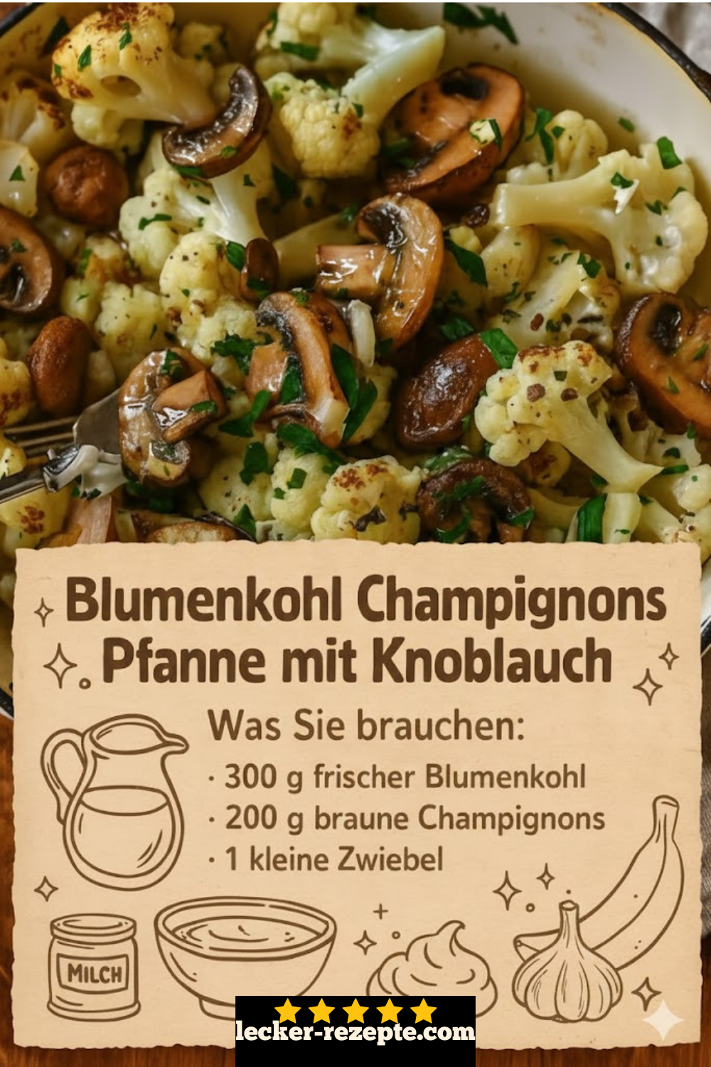Die Blumenkohl-Champignons-Pfanne mit Knoblauch ist aromatisch einfach himmlisch lecker und überzeugt durch Geschmack, Einfachheit und Gesundheit. Mit frischen Zutaten, wenig Aufwand und zahlreichen Variationsmöglichkeiten ist dieses Gericht ein absolutes Must-Try für alle, die schnelle, gesunde und köstliche Mahlzeiten lieben.
