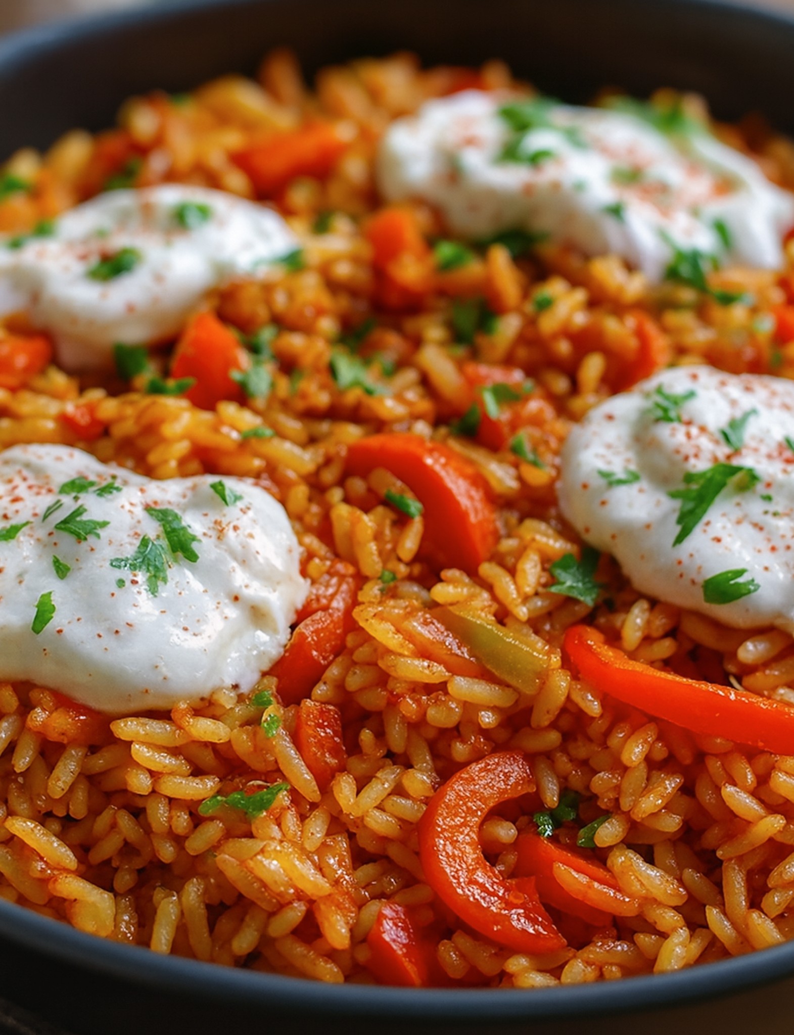 Paprika, Knoblauch, Kräuter und ein Hauch Chili bringen Tiefe in die Bunte Paprika-Reis-Pfanne mit cremiger Sauce.