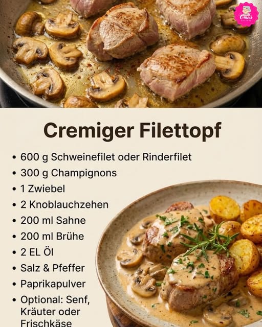 Öl in einem Topf oder einer tiefen Pfanne erhitzen, Filetstücke rundherum scharf anbraten und kurz beiseitestellen.