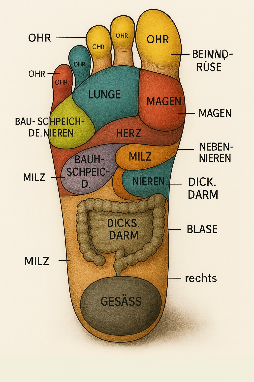 In der Fußreflexzonenlehre entsprechen bestimmte Punkte an den Füßen verschiedenen Organen und Körperbereichen. Eine sanfte Massage wirkt ausgleichend, kann Stress reduzieren und das Nervensystem beruhigen.