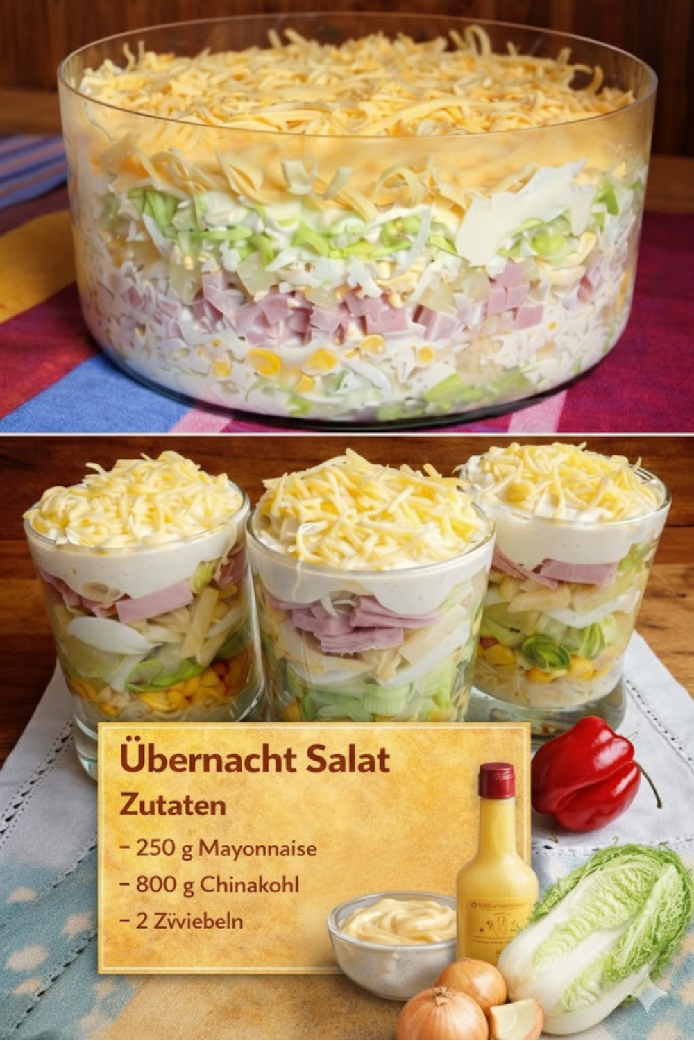 Damit der Übernacht Salat am nächsten Tag noch knackig ist und richtig schmeckt, ist die richtige Schichtung entscheidend: