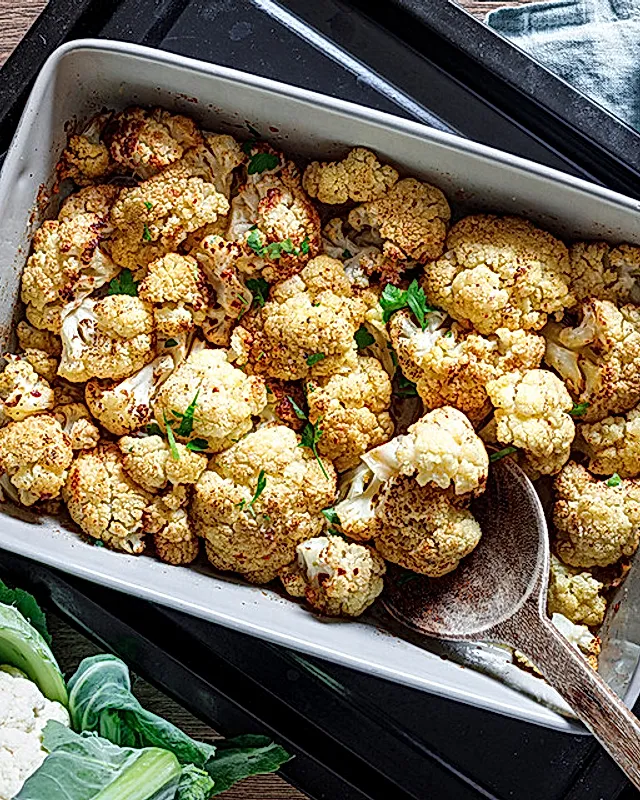 Würze den Blumenkohl mit Kreuzkümmel, Koriander, Zimt und einer Prise Chili. Nach dem Backen mit Granatapfelkernen und Minze bestreuen – perfekt zu Joghurt-Dip oder Hummus.