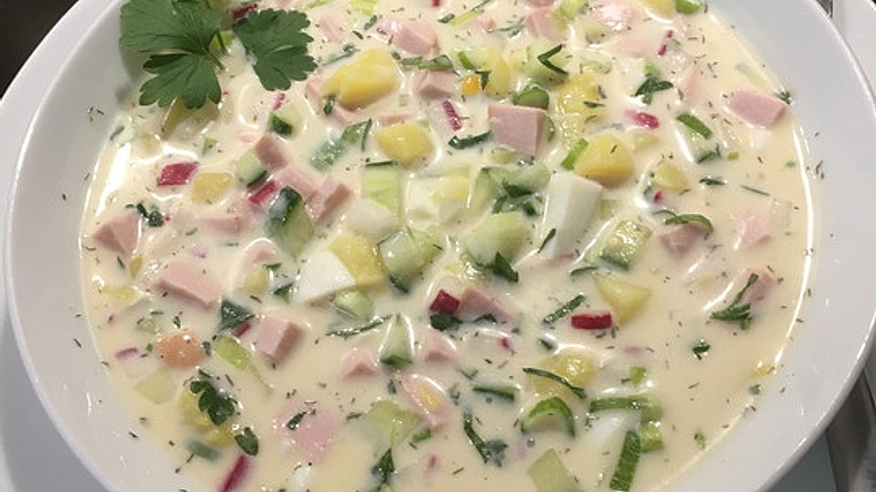 Die klassische Basis bildet Kwas, ein leicht fermentiertes Getränk aus Roggenbrot. In modernen Varianten wird es jedoch häufig durch Kefir, Buttermilch, Mineralwasser oder eine Mischung aus Joghurt und Wasser ersetzt – ideal für alle, die ein milderes Aroma bevorzugen.
