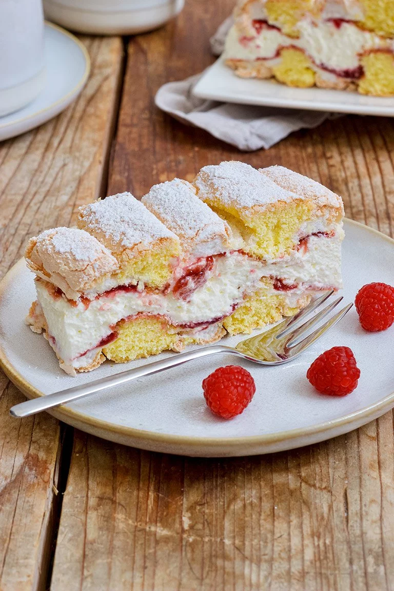 Ersetze die Kaffeecreme durch eine fruchtige Füllung aus Mascarpone, Schlagobers und pürierten Himbeeren. Das verleiht der Mehlspeise eine sommerliche Frische.