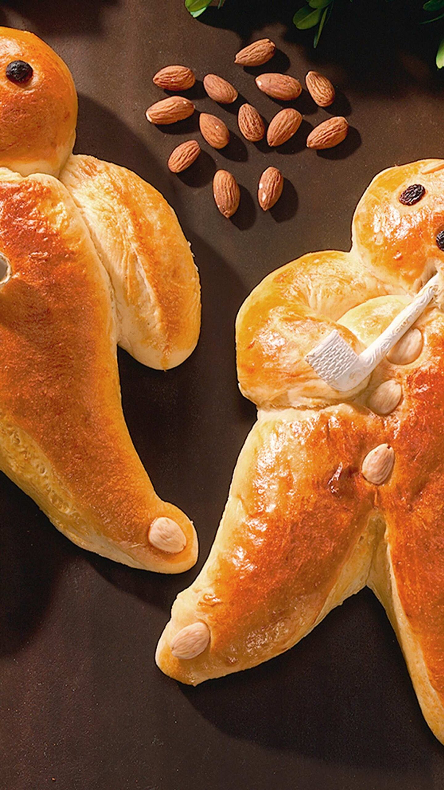 • Die Weckmänner mit der Eigelb-Milch-Mischung bestreichen.