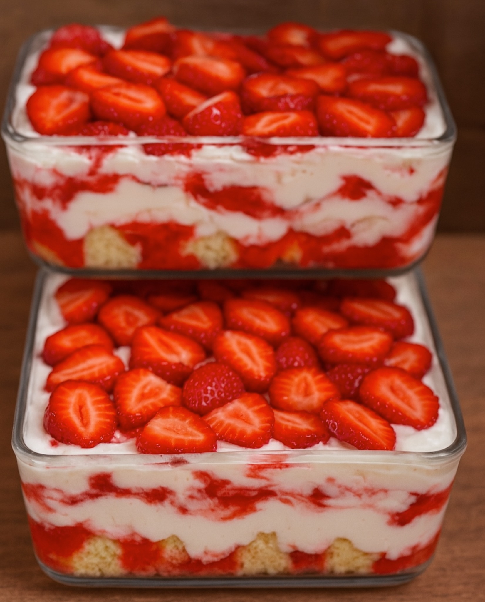 4. Schichten: Biskuits, Creme, Erdbeeren – mehrfach wiederholen.