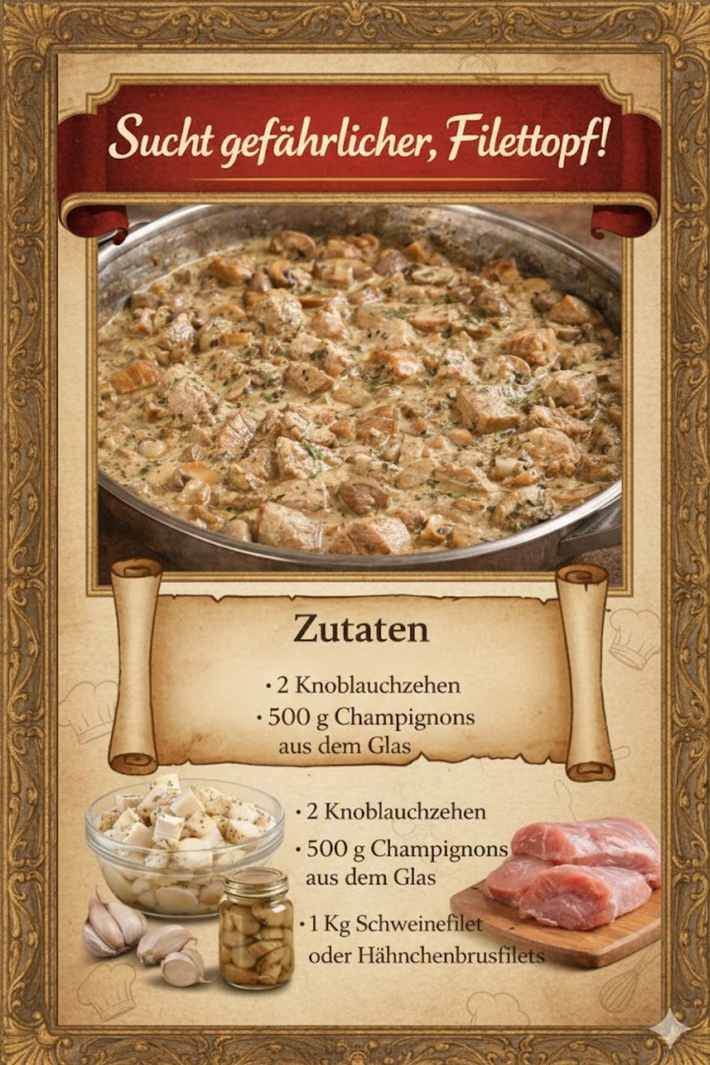Ein Filettopf ist ein Pfannengericht oder Schmortopf, bei dem Filetfleisch (meist Schweinefilet, Rinderfilet oder Hähnchenfilet) in Medaillons geschnitten und in einer aromatischen Sauce serviert wird. Typisch sind Champignons, Zwiebeln, Rahmsaucen oder würzige Fonds. Genau diese Kombination sorgt dafür, dass man nach dem Essen zufrieden zurücklehnt und denkt: <Filettopf, wooow das macht richtig Satt!>