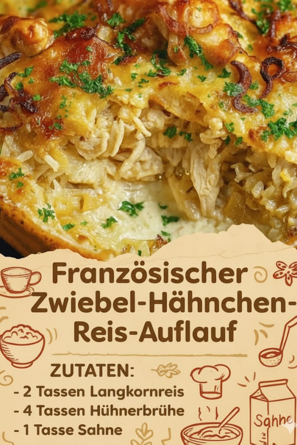 Der Französische Zwiebel-Hähnchen-Reis-Auflauf, unwiderstehlich ist ein Gericht, das Komfort und Eleganz auf einmal vereint. Herzhaft, aromatisch und einfach zuzubereiten, bringt dieser Auflauf die besten Aromen der französischen Küche direkt auf Ihren Teller. Egal, ob Sie ein gemütliches Familienessen planen oder Freunde beeindrucken möchten – dieses Rezept ist ein Volltreffer. In diesem Artikel erfahren Sie Schritt für Schritt, wie Sie diesen Auflauf perfekt zubereiten, welche Zutaten ideal sind und welche Tipps ihn besonders köstlich machen.