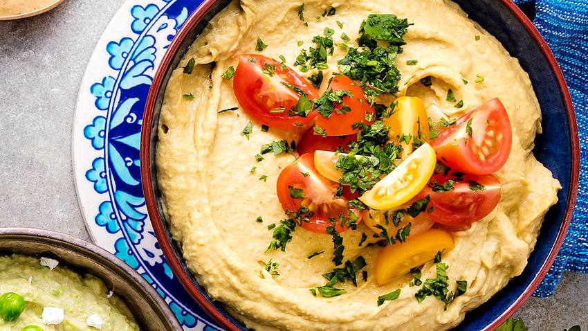 Hummus: Klassiker aus Kichererbsen, Tahini, Knoblauch und Zitrone – reich an Eiweiß.