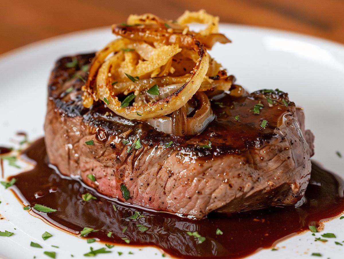 Die Steaks auf vorgewärmte Teller legen, die karamellisierten Zwiebeln darauf verteilen und mit der Sauce übergießen. Sofort servieren.