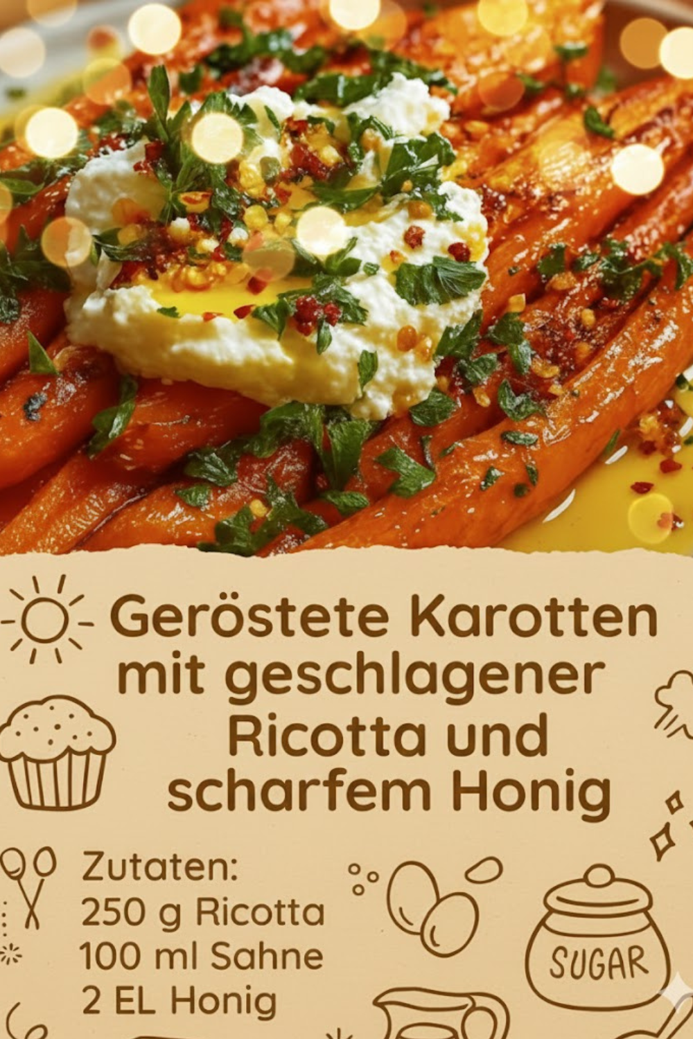 Geröstete Karotten mit geschlagener Ricotta & scharfem Honig, einfach edel lecker kombiniert gesunde Zutaten, einfache Zubereitung und anspruchsvollen Geschmack. Die Süße der Karotten, die Cremigkeit der Ricotta und die pikante Note des Honigs treffen den Geschmack vieler Menschen in Deutschland, Österreich und der Schweiz. Zudem überzeugt das Gericht durch seine ansprechende Optik – perfekt für Gäste oder ein besonderes Familienessen.
