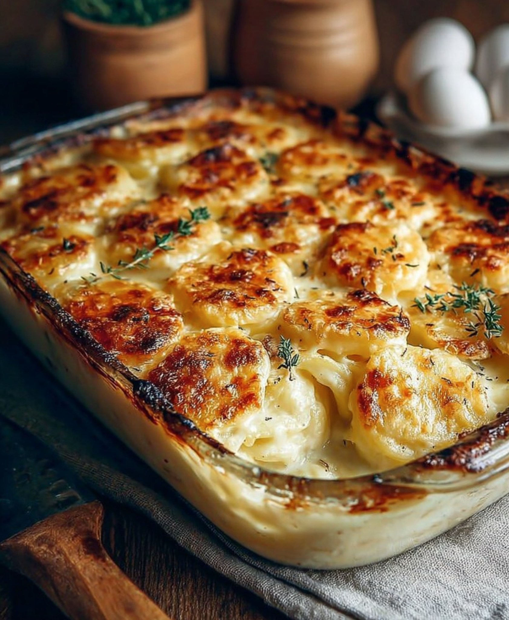 Den großzügigen und cremig gratinierten Dauphinois einige Minuten ruhen lassen, damit sich die Schichten setzen. Perfekt zu Fleischgerichten wie Rinderbraten, Geflügel oder als vegetarische Beilage zu gegrilltem Gemüse.