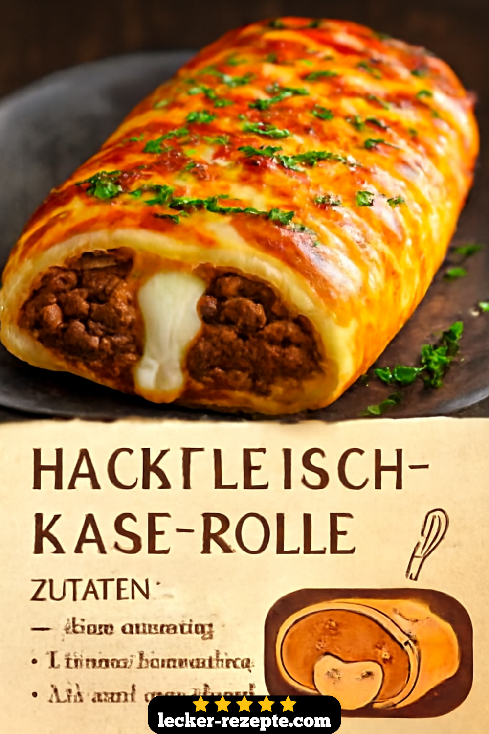 Was ist eine Hackfleisch-Käse-Rolle mit goldener Käsekruste überbacken?