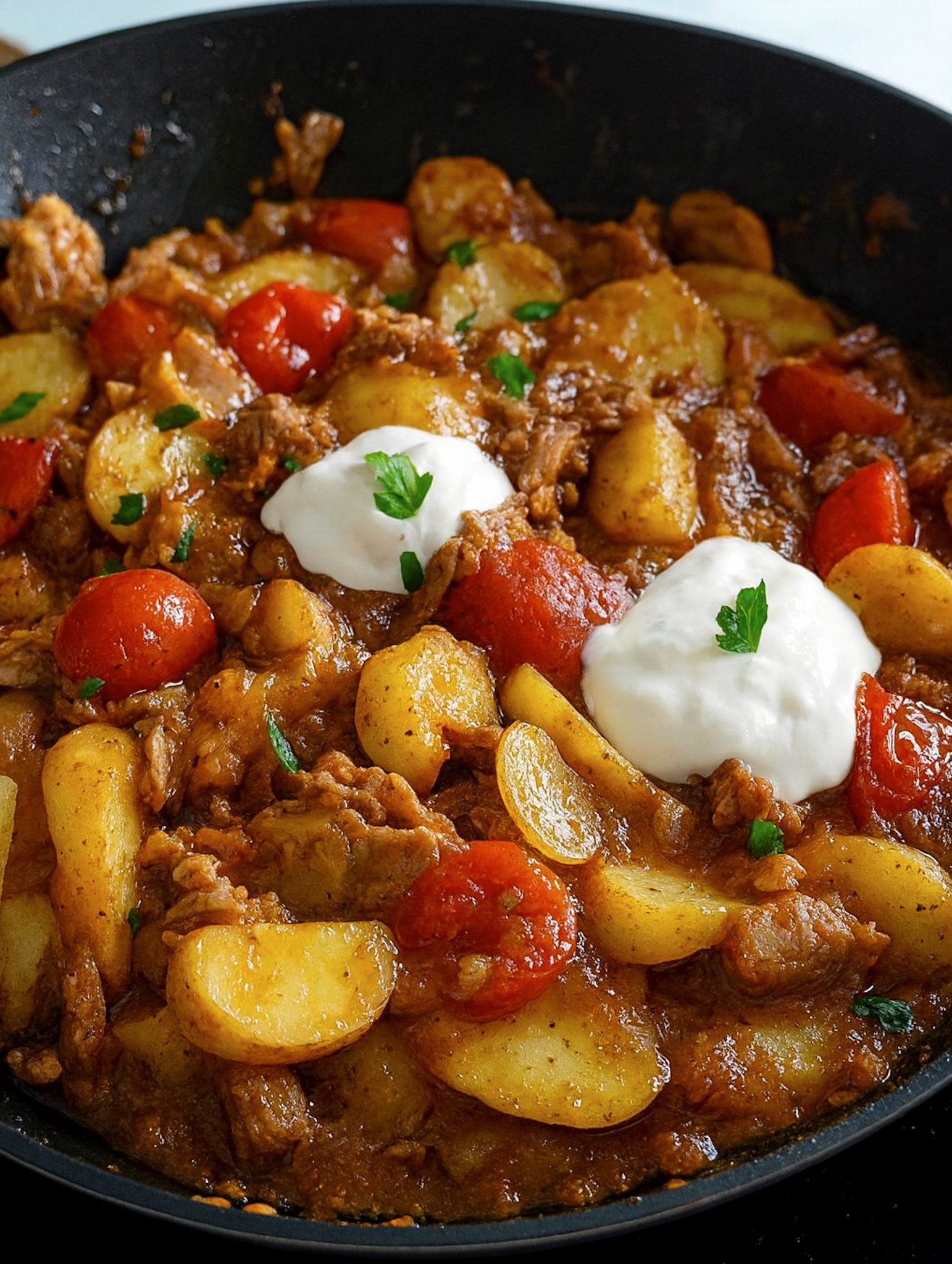 Herzhafte Hackfleisch-Pfanne mit Kartoffeln, Paprika & cremiger Crème fraîche