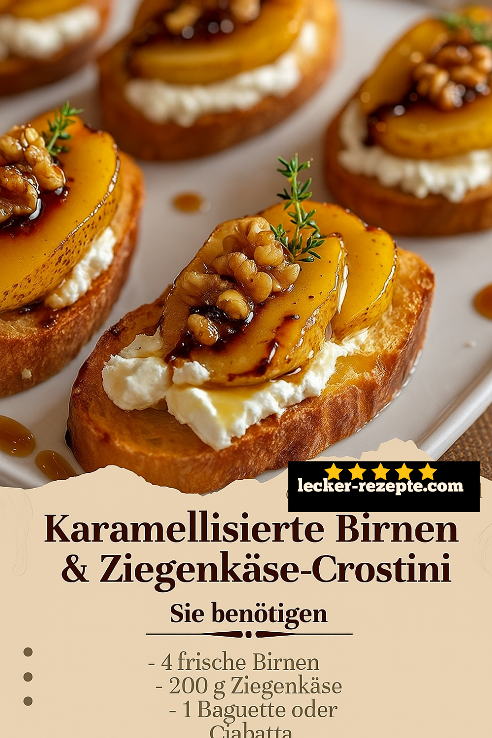 Wenn du auf der Suche nach einem eleganten, aber einfach zuzubereitenden Snack oder einer raffinierten Vorspeise bist, wirst du bei Karamellisierten Birnen & Ziegenkäse-Crostini fündig. Diese Kombination aus süßen, buttrig-weichen Birnen, cremigem Ziegenkäse und knusprigem Baguette ist ein wahrer Hochgenuss für den Gaumen. Ob als Fingerfood für Gäste, als leichtes Abendessen oder als Highlight auf einem festlichen Buffet – dieses Rezept vereint französische Finesse mit mediterraner Leichtigkeit.
