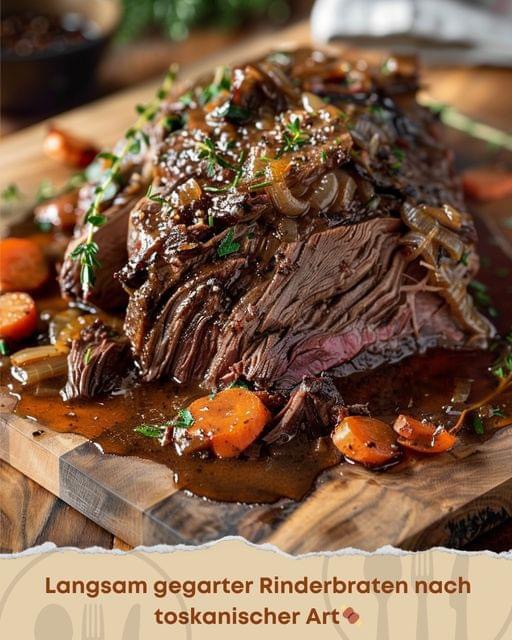 Ein langsam gegarter Rinderbraten nach toskanischer Art ist weit mehr als nur ein Braten – er ist ein Erlebnis. Mit seiner zarten Textur, der aromatischen Sauce und den klassischen mediterranen Kräutern bringt er ein Stück Italien auf den Teller. Egal ob für ein festliches Abendessen, einen gemütlichen Sonntag oder einen besonderen Anlass: Dieses Gericht überzeugt jeden Liebhaber der Fleischküche.