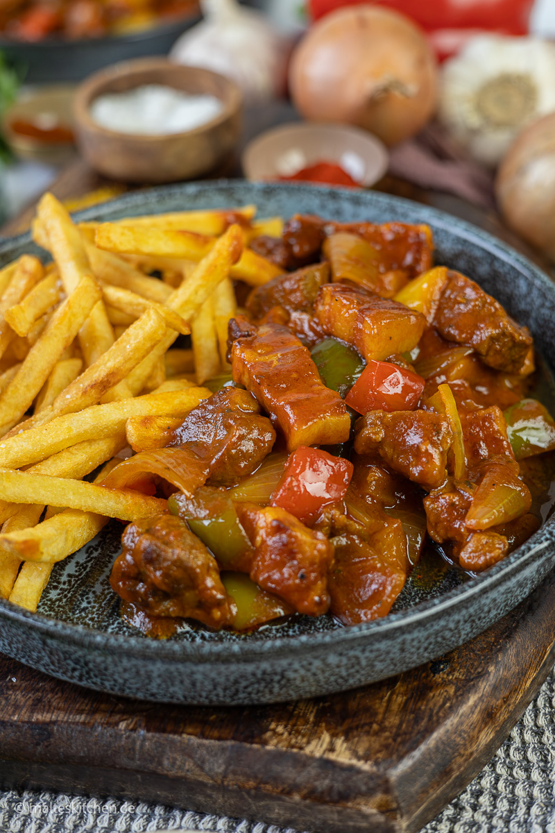 500 g Gulasch gemischt (oder nur Schwein/Rind, oder Hähnchen als leichte Variante)