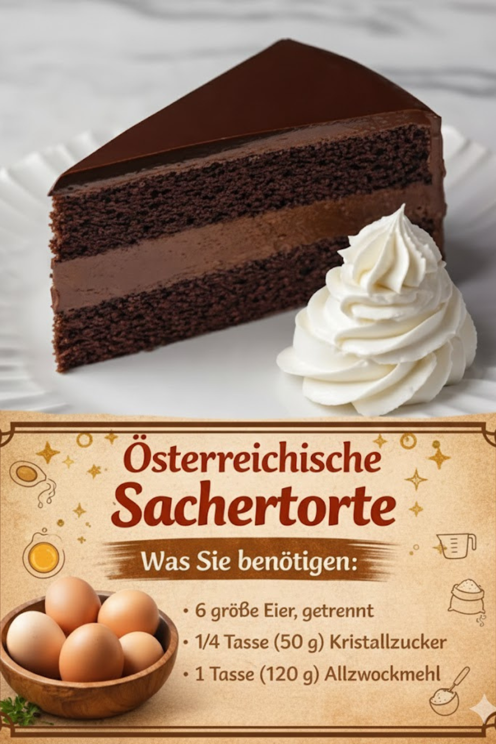 Die Österreichische Sachertorte .. schokoladig, elegant und ein Stück Genussgeschichte ist weit mehr als ein Dessert – sie ist ein Stück Kultur, Geschichte und Genuss zugleich. Ob in einem Wiener Kaffeehaus, bei einem festlichen Anlass oder gemütlich zu Hause: Wer einmal ein Stück dieser Torte probiert hat, versteht die Faszination sofort.