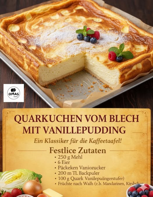 • **Quarkkuchen vom Blech mit Vanillepudding**