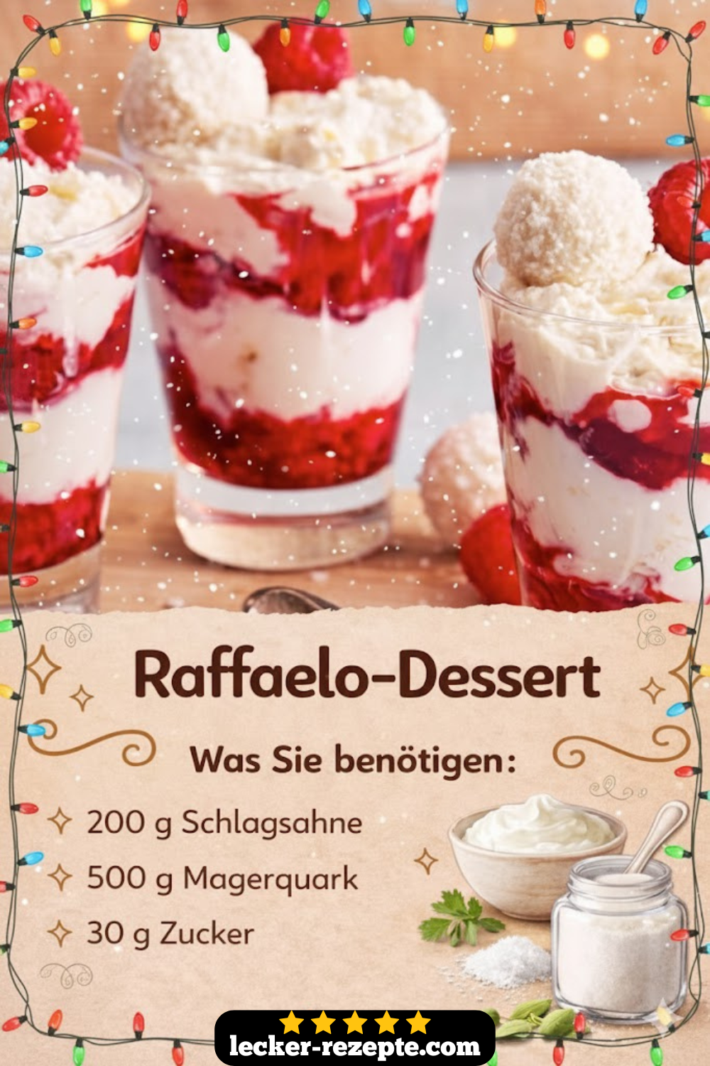 Ob klassisch, fruchtig oder schokoladig – Raffaello-Dessert ist cremig, kokosnussig und schmeckt wie Urlaub auf der Zunge, pure Verführung im Glas. Es vereint exotische Aromen, zarte Süße und eine luxuriöse Textur zu einem Dessert, das immer begeistert. Mit wenigen Zutaten, etwas Zeit und Liebe zum Detail zauberst du einen Genussmoment, der an Sonne, Meer und Entspannung erinnert. Perfekt für alle, die sich und ihren Gästen ein kleines Stück Urlaub gönnen möchten.