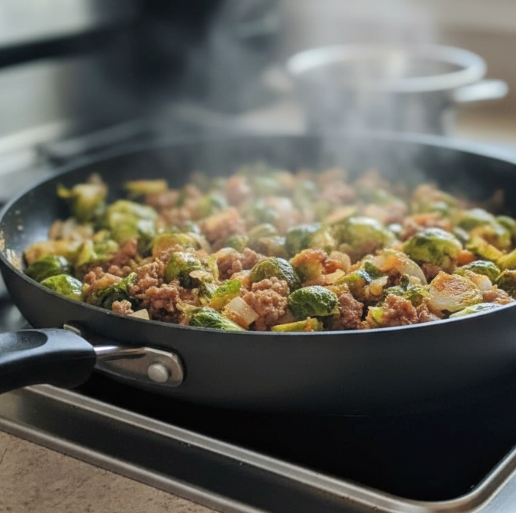 Wer auf Kohlenhydrate verzichten möchte, serviert die Pfanne pur oder ergänzt sie nur mit etwas Blumenkohlreis. Hackfleisch und Rosenkohl liefern ausreichend Proteine und Ballaststoffe, sodass man lange satt bleibt.