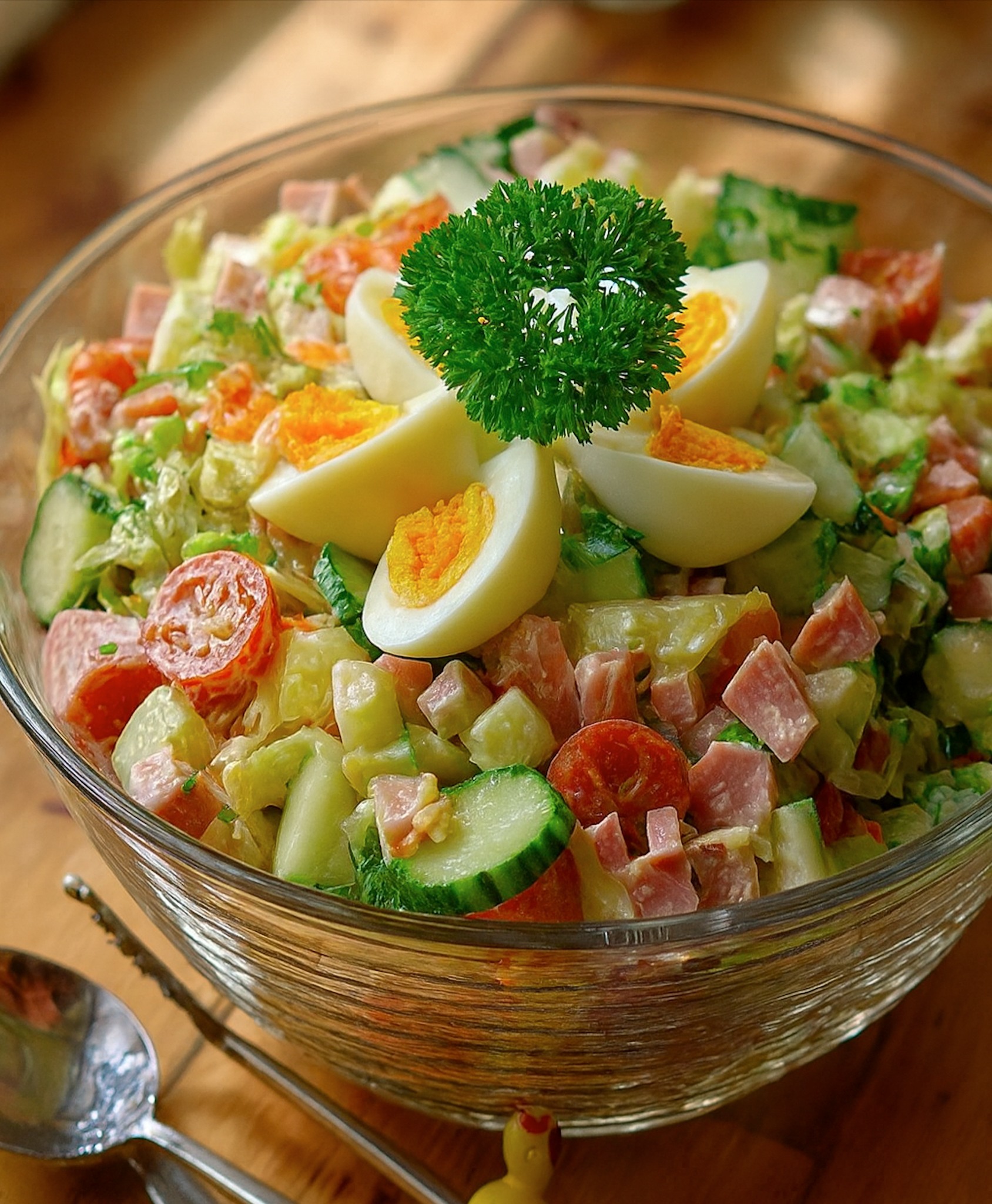 Die Kombination aus Ei, Schinken und frischem Gemüse macht diesen Salat zu einer ausgewogenen Mahlzeit, die Energie liefert, aber gleichzeitig leicht verdaulich ist. Perfekt für Berufstätige, Familien oder alle, die auf ihre Gesundheit achten.