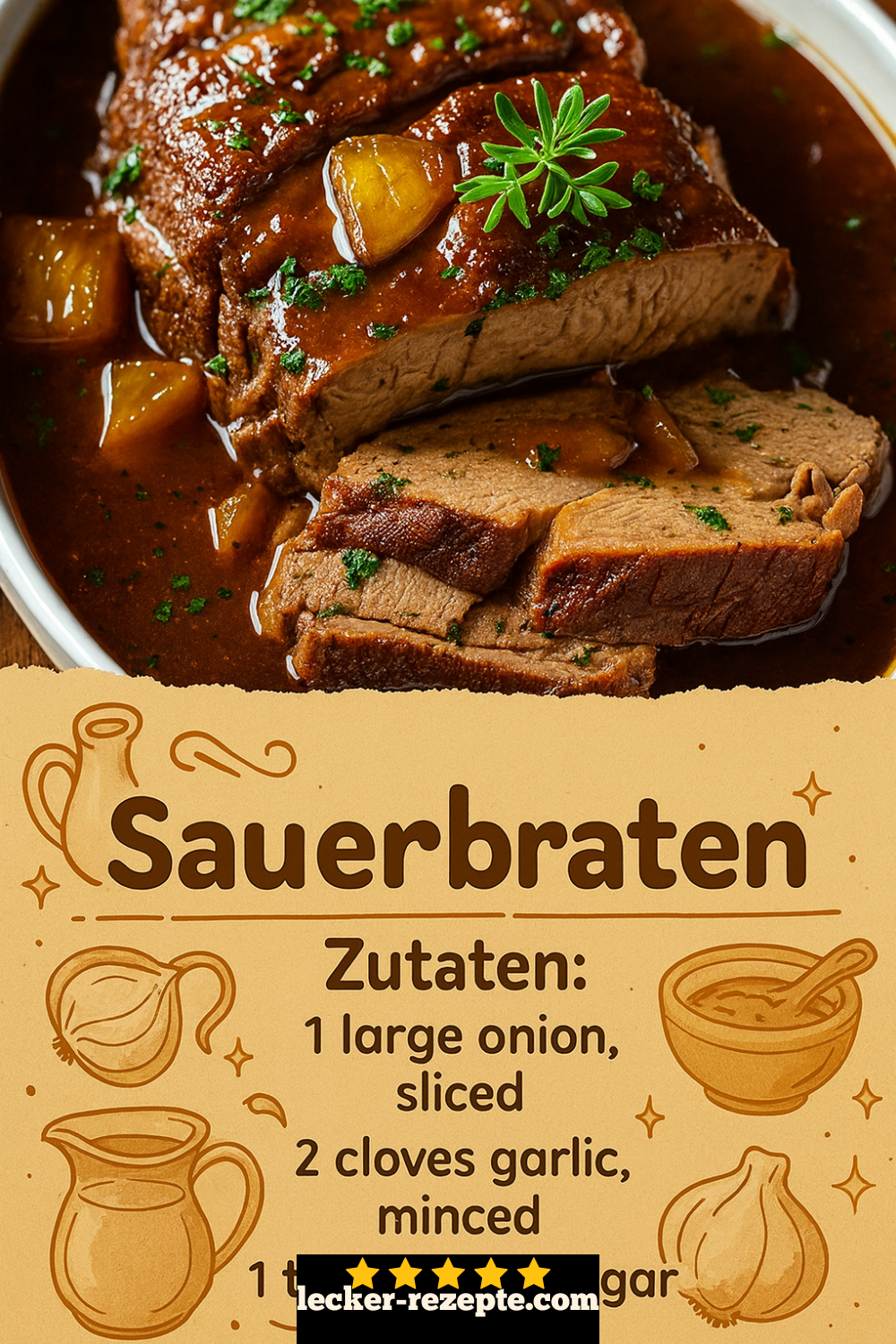 Was Sauerbraten – ein Stück deutscher Tradition besonders auszeichnet, ist die Marinade. Sie besteht klassisch aus: