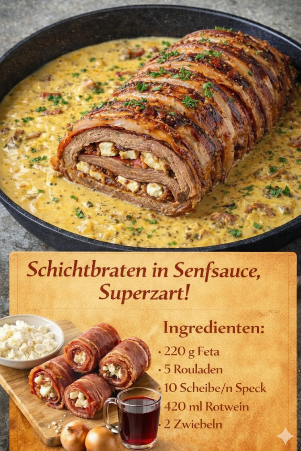 Der Schichtbraten in Senfsauce kombiniert mehrere Vorteile: