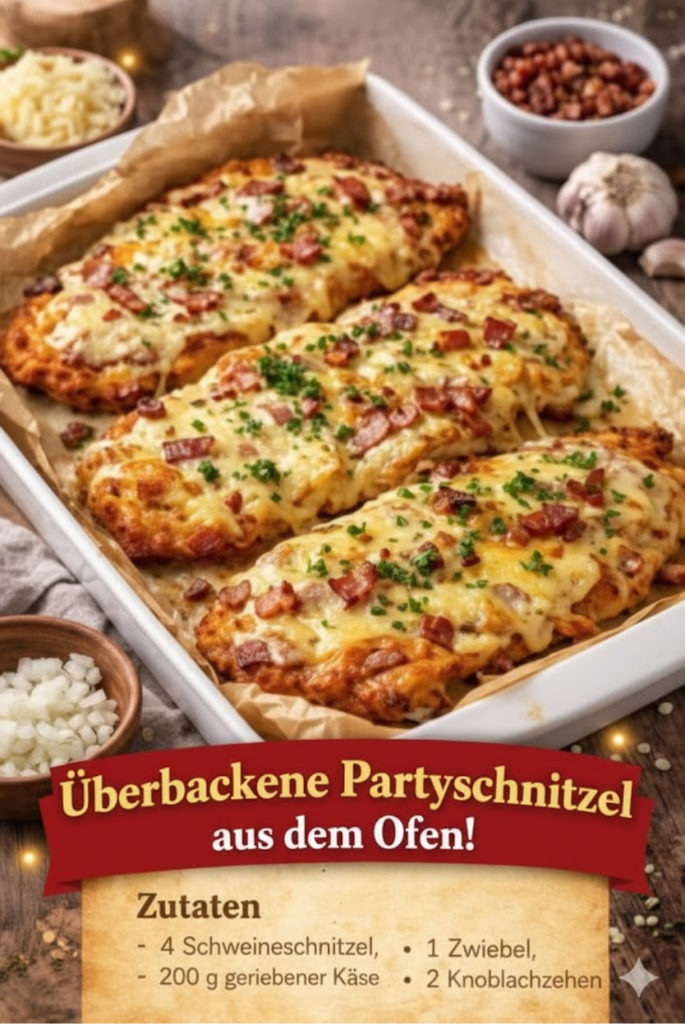 Probieren Sie es aus, genießen Sie den Duft von frisch gebackenem Käse und saftigem Fleisch, und erleben Sie selbst, warum Schmeckt unglaublich, Überbackene Partyschnitzel aus dem Ofen einfach unwiderstehlich ist.