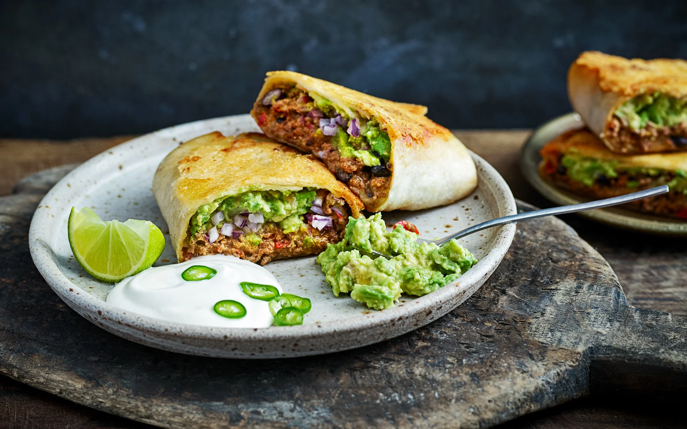 Vegane Burritos lassen sich mit Bohnen, Süßkartoffeln, Avocado und pflanzlichem Käse kreieren. Auch Cashew-Sauerrahm ist eine köstliche Alternative zu Crème fraîche.