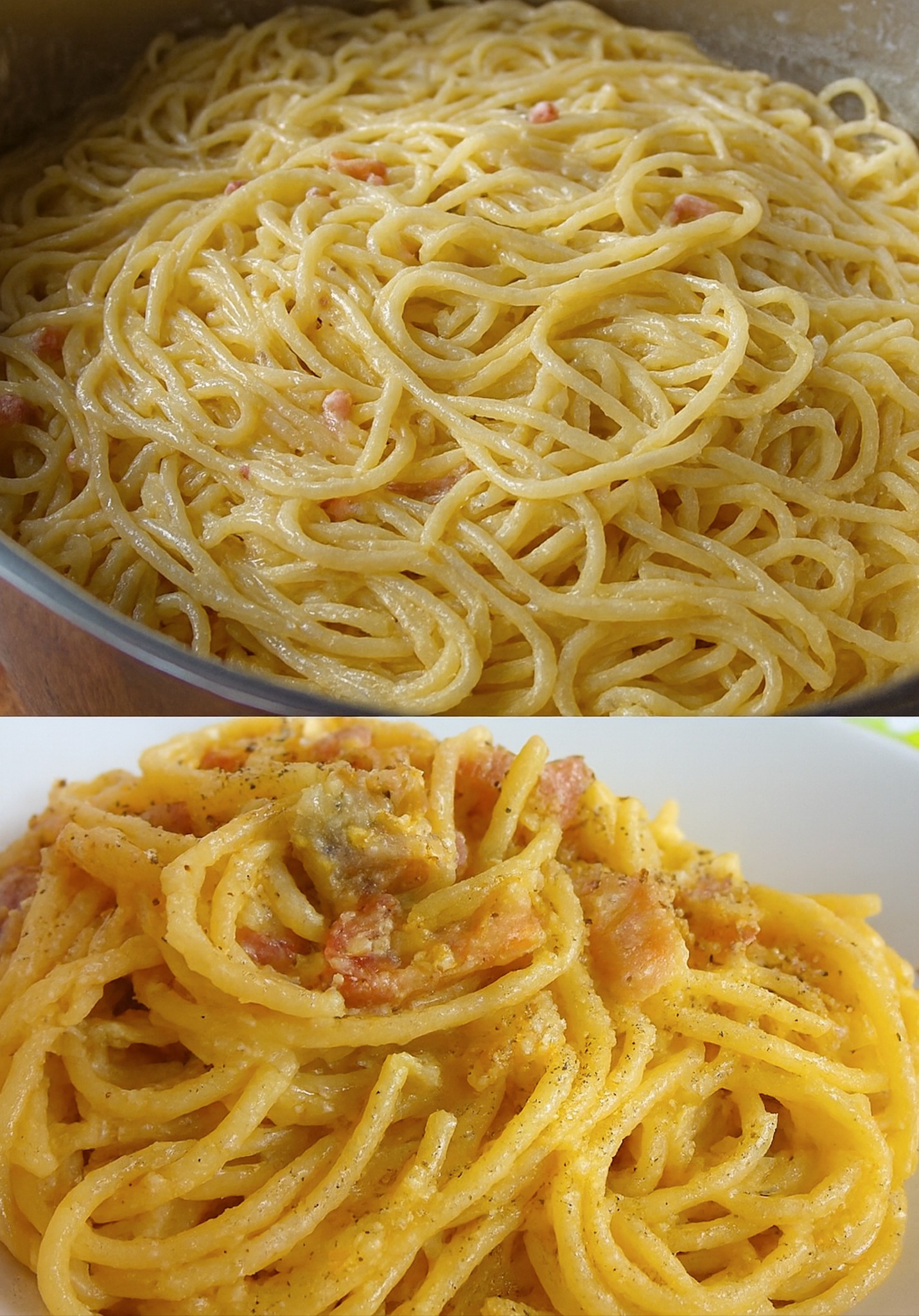 Mit frisch gemahlenem Pfeffer und nach Bedarf etwas extra Pecorino bestreuen. Sofort servieren – Spaghetti alla Carbonara, immer wieder ein Genuss schmecken am besten heiß und frisch.