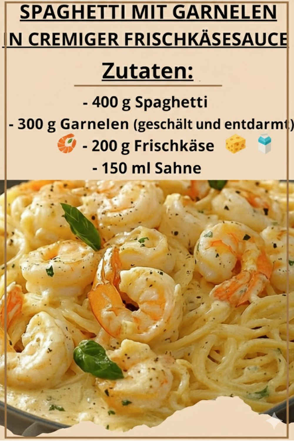 Diese Zutatenliste ist bewusst simpel gehalten – so lassen sich Spaghetti mit Garnelen in cremiger Frischkäse-Sauce schnell gemacht & himmlisch lecker auch unter der Woche problemlos zubereiten.