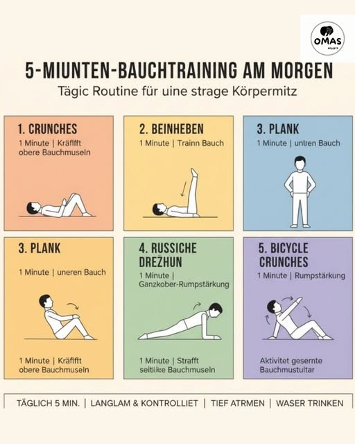Starte deinen Tag aktiv und effizient! Nur 5 Minuten am Morgen reichen, um deine Körpermitte zu stärken, die Haltung zu verbessern und deinen Stoffwechsel anzukurbeln – ganz ohne kompliziertes Equipment.