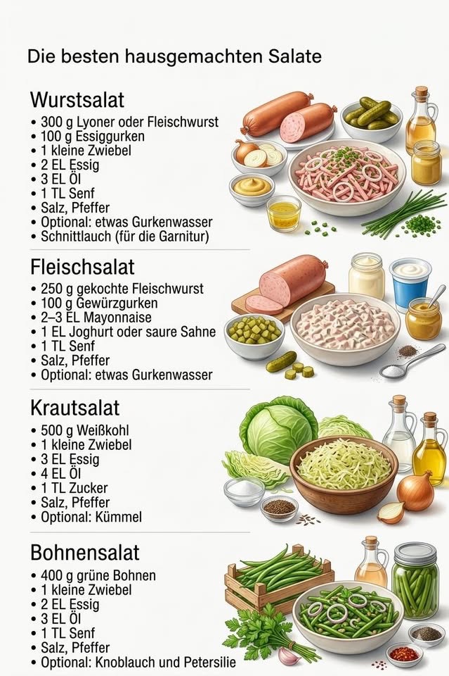 : Zutaten: gekochte Fleischwurst (ca. 250 g), Gewürzgurken (ca. 100 g), 2–3 EL Mayonnaise, 1 EL Joghurt oder saure Sahne, 1 TL Senf, Salz, Pfeffer, optional etwas Gurkenwasser
