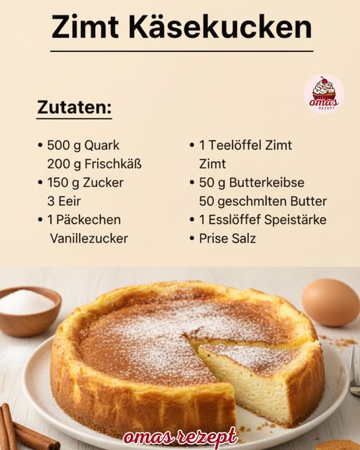 Quark, Zucker, Eier, Sahne, Zimt, Vanillezucker, Backpulver und Salz in einer großen Schüssel glatt rühren
