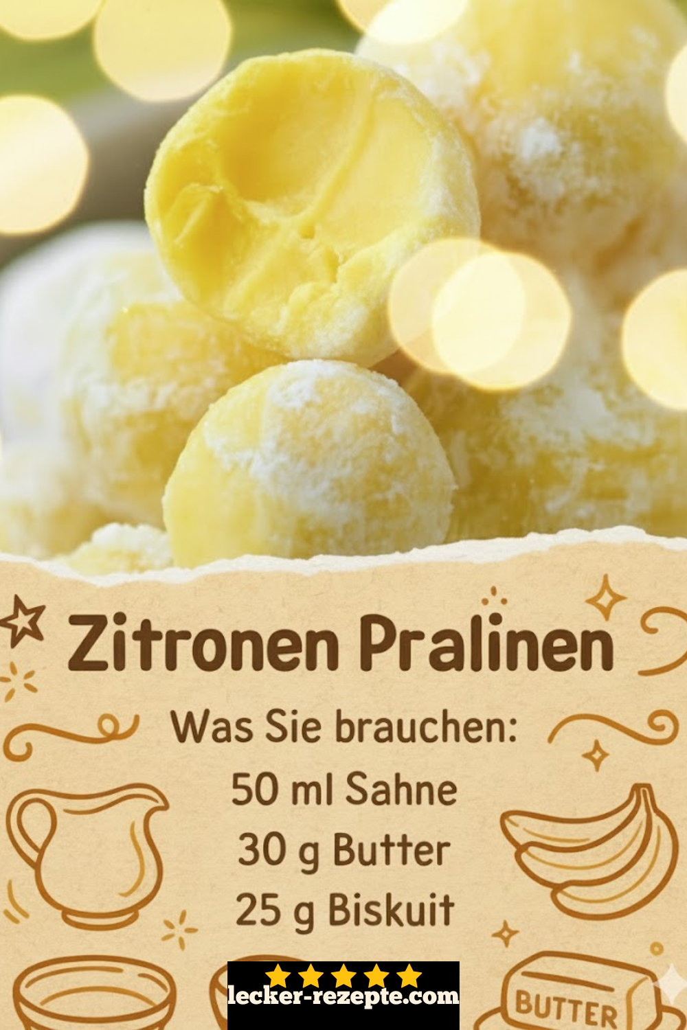 Wer liebt sie nicht – kleine, süße Köstlichkeiten, die einem das Gefühl von Sonne und Leichtigkeit schenken? Zitronen-Pralinen sind erfrischend einfache kleine Sonnenhappen zum Genießen und vereinen süße Cremigkeit mit der spritzigen Frische der Zitrone. Sie sind perfekt für zwischendurch, als kleines Mitbringsel oder als Highlight auf jeder Kaffeetafel. Ob für gemütliche Nachmittage zu Hause oder für festliche Anlässe – diese Pralinen bringen einen Hauch Sommer in jede Jahreszeit.